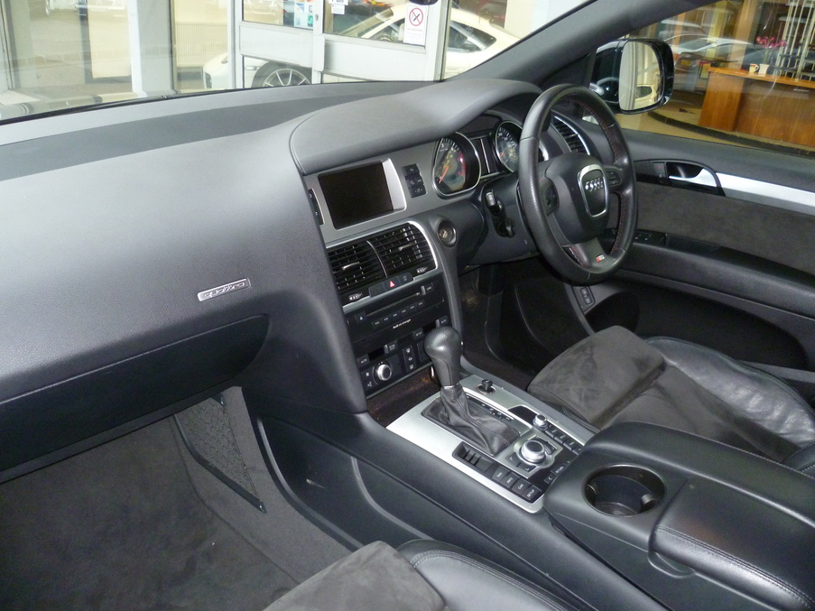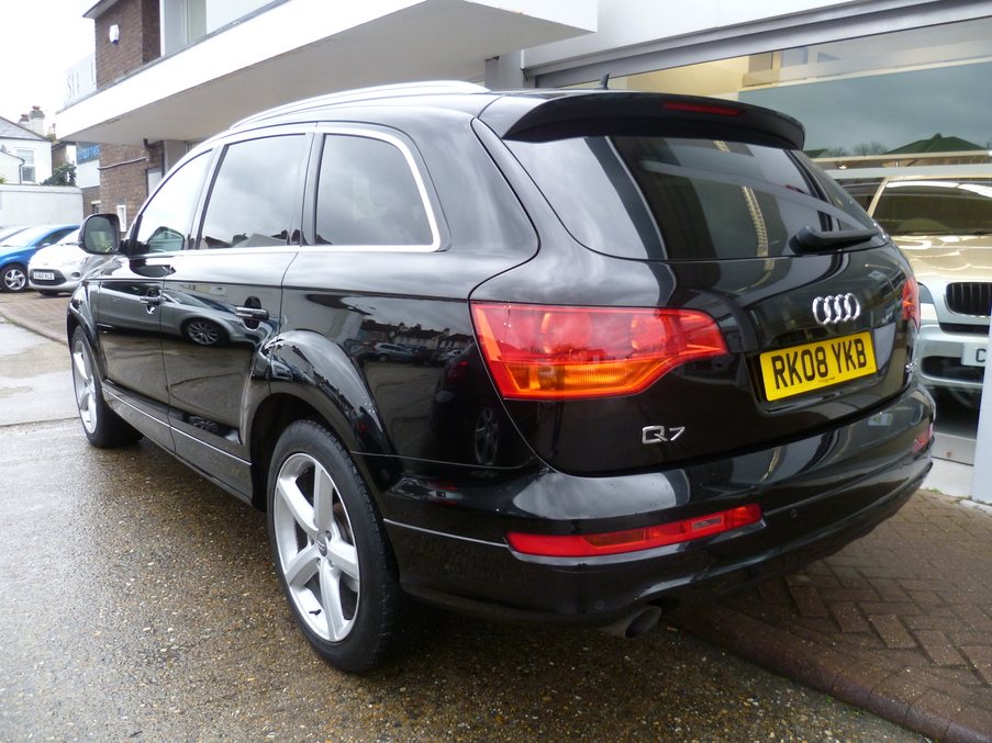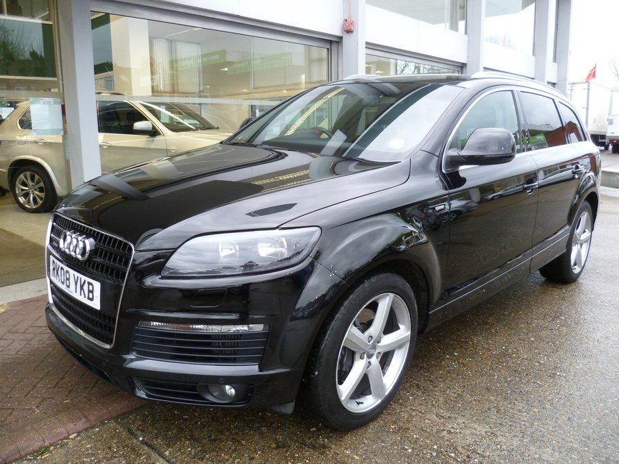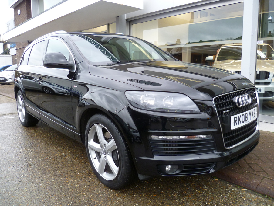 AUDI Q7 3.0 TDI Quattro 240 S Line Tip, 5 Doors, Automatic, Estate, Diesel, 2008 08 Reg, 47000 miles, Metallic Phantom Black, MOT-03-2014, 1 Owner. Full Audi Service History, Satellite navigation, Leather / Alcantara Seats. ABS, Alloy wheels, Cruise control, Front armrest, Headlight washers, Folding rear seats, Lumbar support, Immobiliser, Passenger airbag, Rear armrest, Radio/CD, Rear headrests, Sports seats, Roof rails, Side airbags, Traction control, Body coloured bumpers, Trip computer, 3x3 point rear seat belts, Alarm, Audio remote control, Front electric windows, Front fog lights, Electric door mirrors, Heated door mirrors, PAS, Rear wiper, Remote central locking, Steering wheel rake adjustment, Drivers airbag, Electrically adjustable drivers seat, Electrically adjustable passenger seat, Steering wheel reach adjustment, Reverse parking aid, Service indicator, Front head restraints, Isofix child seat anchor points, Solid Paint, Space saver spare wheel, Partial leather seat trim, Rear electric windows. Insurance Group:16.