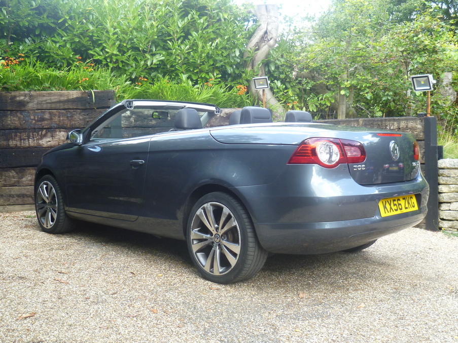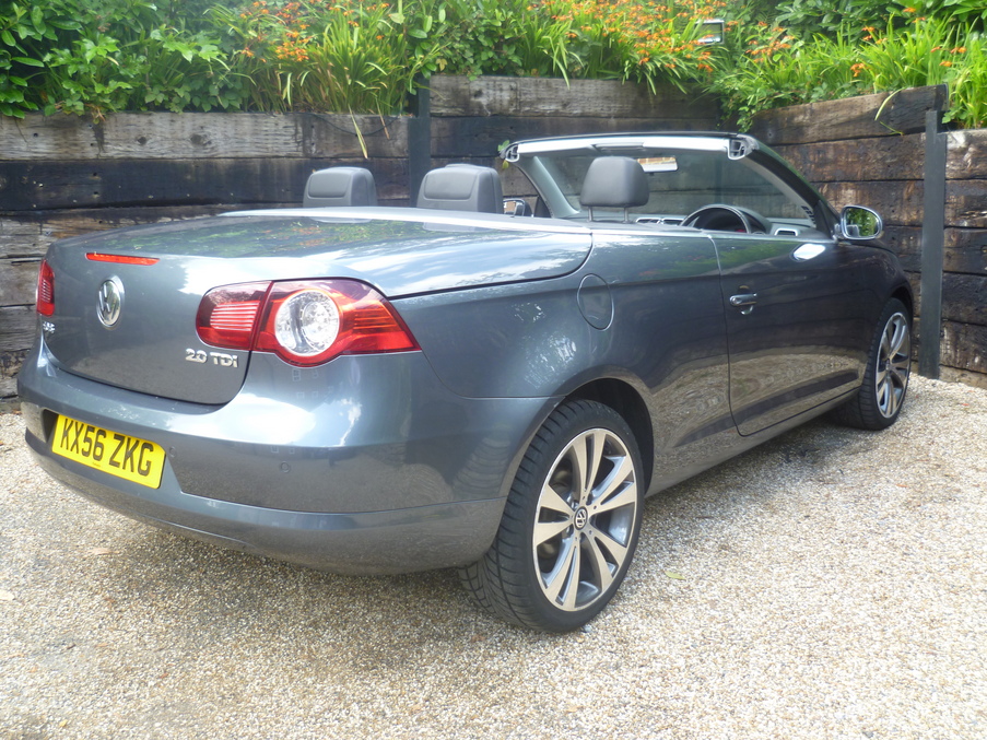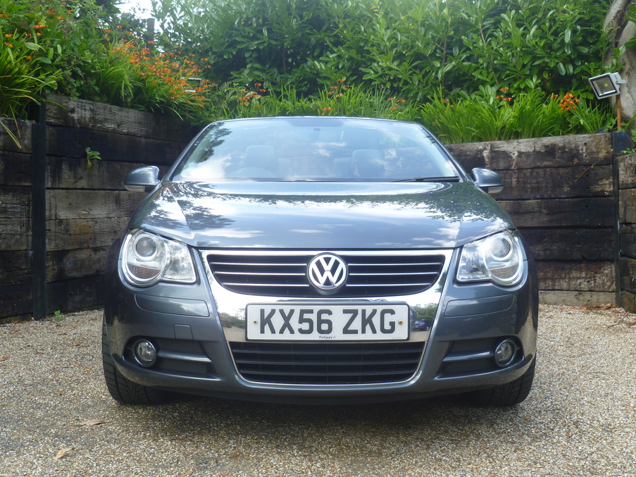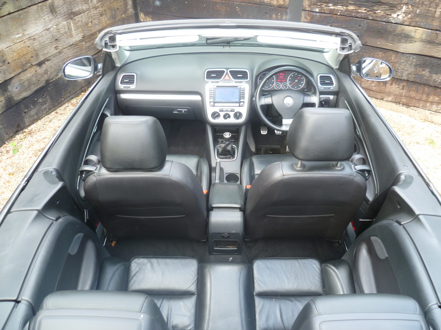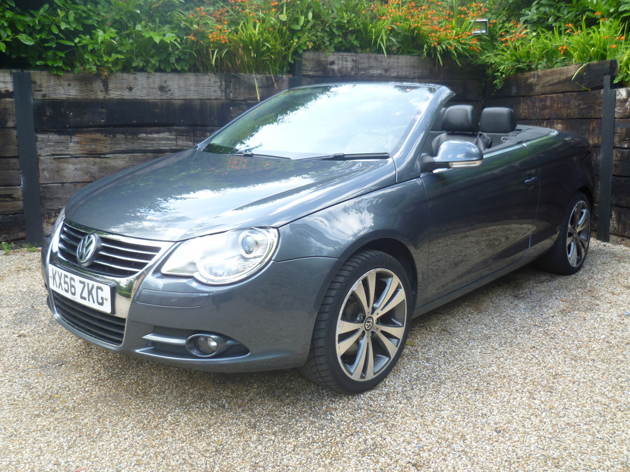 Stunning Eos Finished in Island Grey Pearl with Full Heated Black Nappa Leather, Sat Nav, 18" Wheels and a Full VW History inc Cambelt., Upgrades - Nappa leather upholstery + heated front seats, DVD Navigation/radio system inc. armrest mounted 6 CD autochanger, 8 speakers & Highline multifunction computer, 18" Chicago alloy wheels with titanium silver finish + anti theft wheel bolts, Metallic paint, 12 months MOT, Full dealership history, Standard Features - CSC roof system - 5 section folding roof including slide/tilt sunroof, Semi-automatic air conditioning, Rear parking sensor, Front and rear electric windows, Height/reach adjust steering wheel, Electronic stabilisation programme with electronic differential lock + traction control, Front sports seats, Flat tyre indicator, Alarm with interior protection, Electric heated + adjustable door mirrors, Electronic engine immobiliser, Easy entry slide seats (access to rear seats), Front seats with height+lumbar adjust. 4 seats, Full dealer facilities including warranty and finance at competitive rates subject to status.